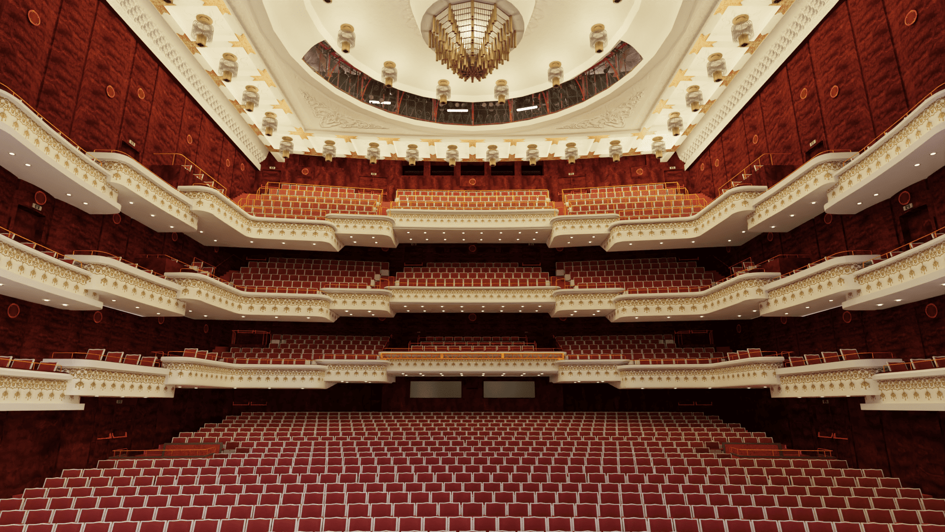 掃描區域包含:表演大廳一至三樓、觀眾席全區、舞台一至五樓(含貓道與吊桿結構)、以及觀眾席吊燈頂部貓道區域。